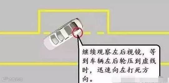 8、当左侧后轮即将压住二号线时,迅速向左打满方向;