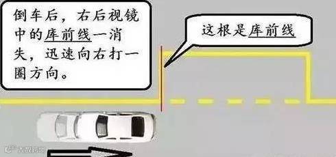 挂倒挡,开始倒车,观察右后视镜,当库前线即将从后视镜中消失(即库的左前角即将消失)时,立即向右打满方向。