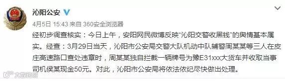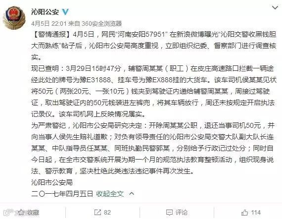 原文:【警情通报】4月5日,网民“河南安阳57951” 在新浪微博曝光“沁阳交警收黑钱胆大而熟练”帖子后,沁阳市公安局高度重视,立即组织纪委、督察部门进行调查核实。现已查明:3月29日15时47分,辅警周某某(职工)在皮庄高速路口拦截一辆途经此处的牌号为豫E31888、挂车号为豫EX888挂的大货车。该车司机侯某某见状将50元(两张20元、一张10元)钱夹到驾驶证内递给辅警周某某,周接过驾驶证,取出驾驶证内的50元钱装进左裤兜,将其车辆放行,周还未按规定开启执法记录仪。该车司机网上反映情况属实。为严肃警纪,沁阳市公安局研究决定:开除周某某公职,退还当事司机50元,并向当事人侯先生赔礼道歉;对负有领导责任的沁阳市公安局交警大队副大队长连某某、中队指导员任某某、同班执勤民警郭某,分别给予行政记过处分;同时自今日起,在全市交警系统开展为期一个月的规范执法教育整顿活动,组织现身说法、警示教育,坚决杜绝此类违法违纪事件再次发生。沁阳市公安局二〇一七年四月五日