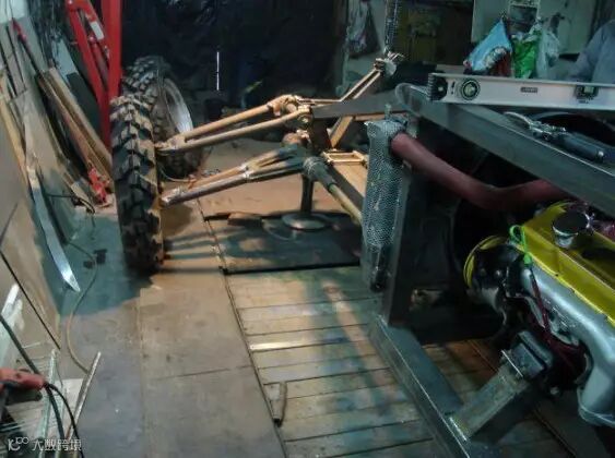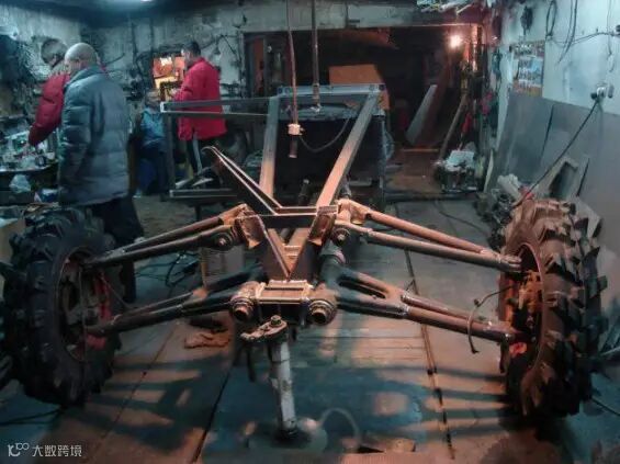 首先,把拖拉机的前轮轮距加宽,为了让车子更加稳固,车体采用了方形加厚钢材焊接而成。