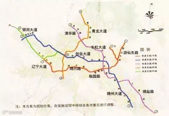 按照绵阳轨道交通远景规划,到2050年,绵阳将建成5条轨道交通,总长度达126.6公里。其中:1、2、3号线为骨架线路;4号线为放射线联络线;5号线为市域线。