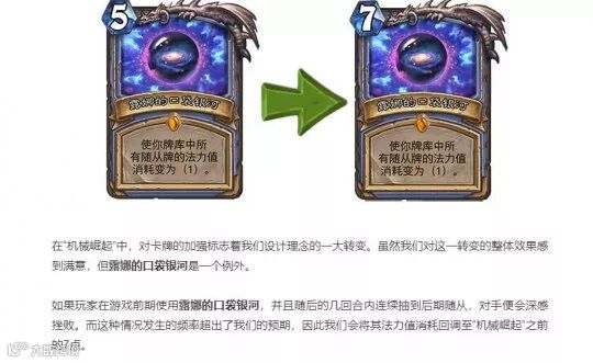 最令人无语的改动,要属法师职业卡的改动了。在上一波的平衡补丁当中,咒术师的召唤以及露娜的口袋银河得到了加强。