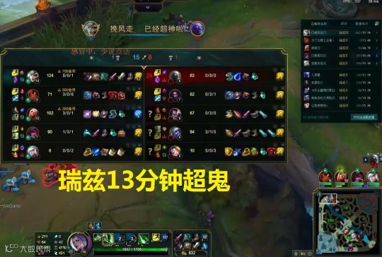 由于第一波gank十分完美,所以岩雀就死帮上路,以至于对面瑞兹一上线就被击杀,不是在防御塔下被强杀就是在上线的路上被杀,在13分钟的时候瑞兹就已经超鬼。