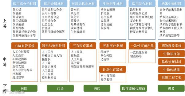 从产业链角度来看,生物医用材料上游领域包括金属材料、高分子材料、无机非(陶瓷)材料、生物衍生材料等;下游是植介入医疗器械主要应用商,包括各大医院、各类门诊、美容整形机构、医药经销商、器械代理商等,其最终应用为患者即应用终端。