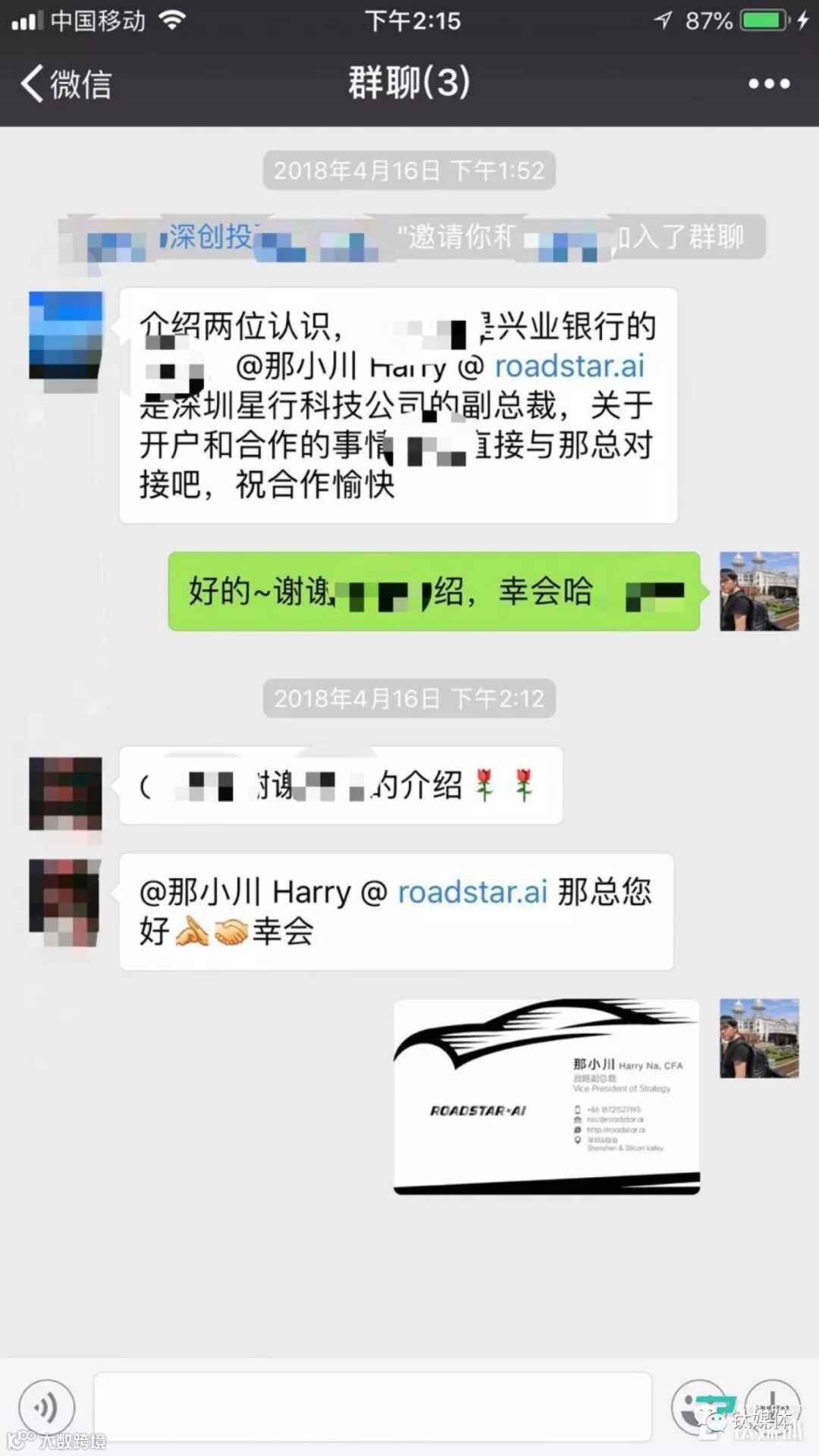 钛媒体获悉的微信聊天截图显示,深创投的投资款到账之时,投资人向那小川推荐兴业银行作为打款银行,双方接洽之后,兴业银行方面建议Roadstar将这笔投资款以活期存款放在兴业银行,并为Roadstar申请了高出定期挂牌价的活期利率。