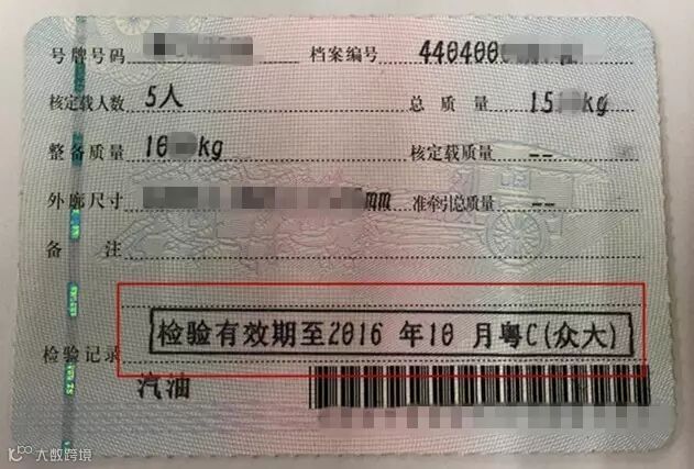 上图为行驶证为例,行驶证副页标注的机动车检测日期,说明该机动车检验有效期至2016年10月。这意味着在2016年8月、9月、10月均属于有效期内的检验,超过10月则为逾期。