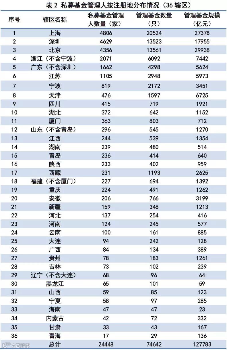 截至2018年12月底,已登记私募基金管理人数量从注册地分布来看(按36个辖区),集中在上海、深圳、北京、浙江(除宁波)、广东(除深圳),总计占比达71.68%,略高于11月份的71.67%。