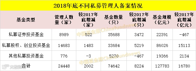 数据显示,截至2018年12月底,已登记私募证券投资基金管理人为8989 家,较2017年末增加了522家;同时,私募股权、创业投资基金管理人为14683 家,较2017年末大幅增加了1483家;其他私募投资基金管理人776家,较2017年末减少了3家。