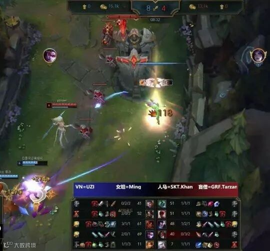在LPL里UZI的对线能力是很强的,小狗还是小狗,路人局就是发挥个人实力的天堂,薇恩两个人头再加上近30刀补兵,卡莎的前期可谓血崩,基本上是没有了。UZI方打野豹女常常光顾下路使得在十四分钟前就打掉了防御塔大半镀层。不过反观上路,Khan的发育也很舒服,配合盲僧也把对方杰斯抓成了0-3。总体来说双方还算是势均力敌的,