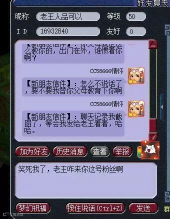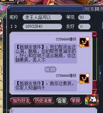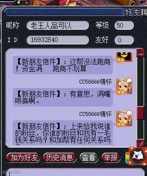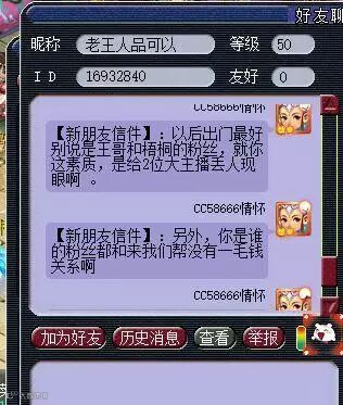主播向我们叙述了事情的经过:“今天刚下播,整理东西后准备下号睡觉。突然有人加好友,问自己在不在?说要加入帮派跑商,还说是老王和梧桐的粉丝,给我整懵逼了。”本想好心好意地说帮派的资金是满的,跑商不划算,结果对方直接开喷。