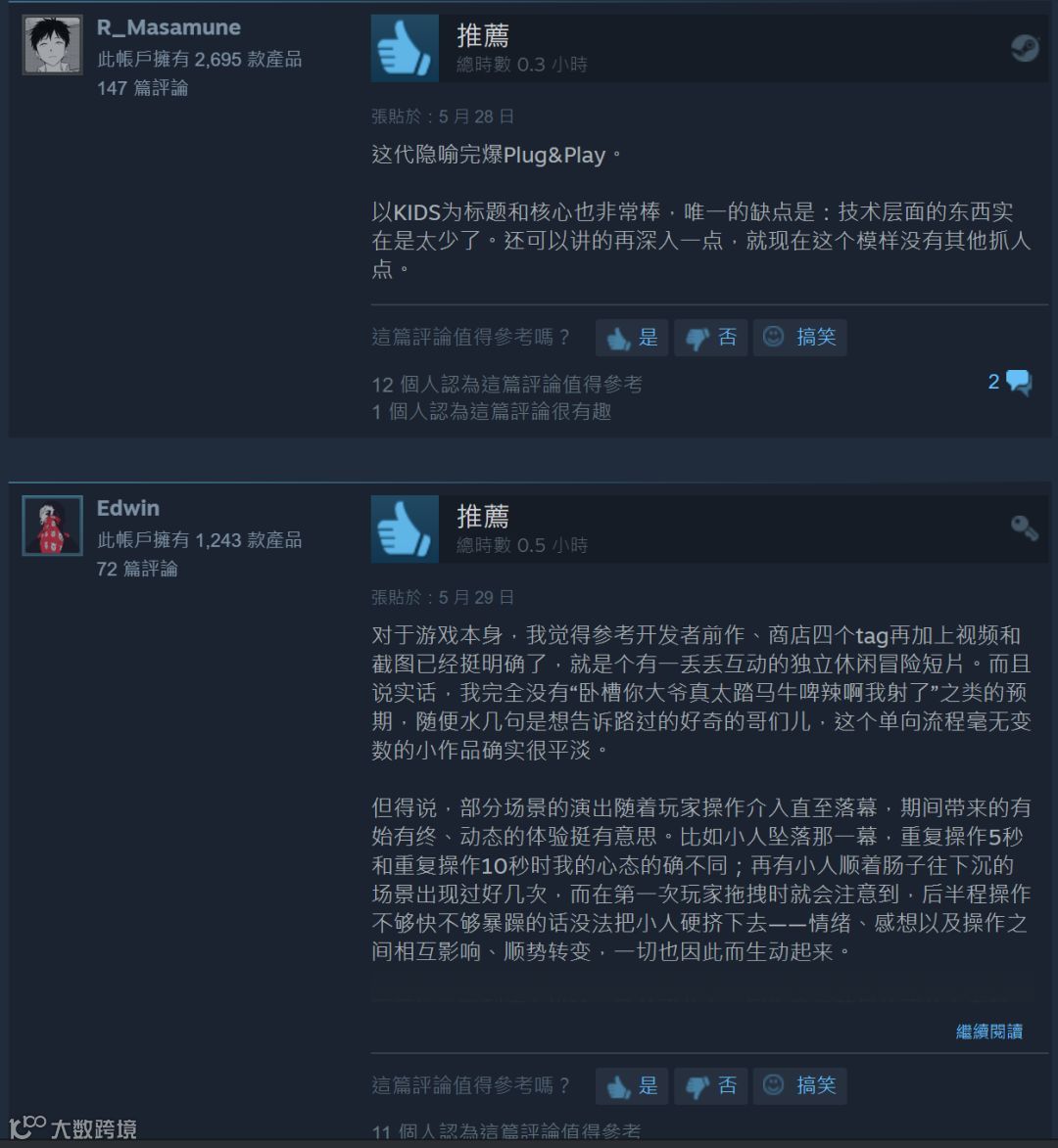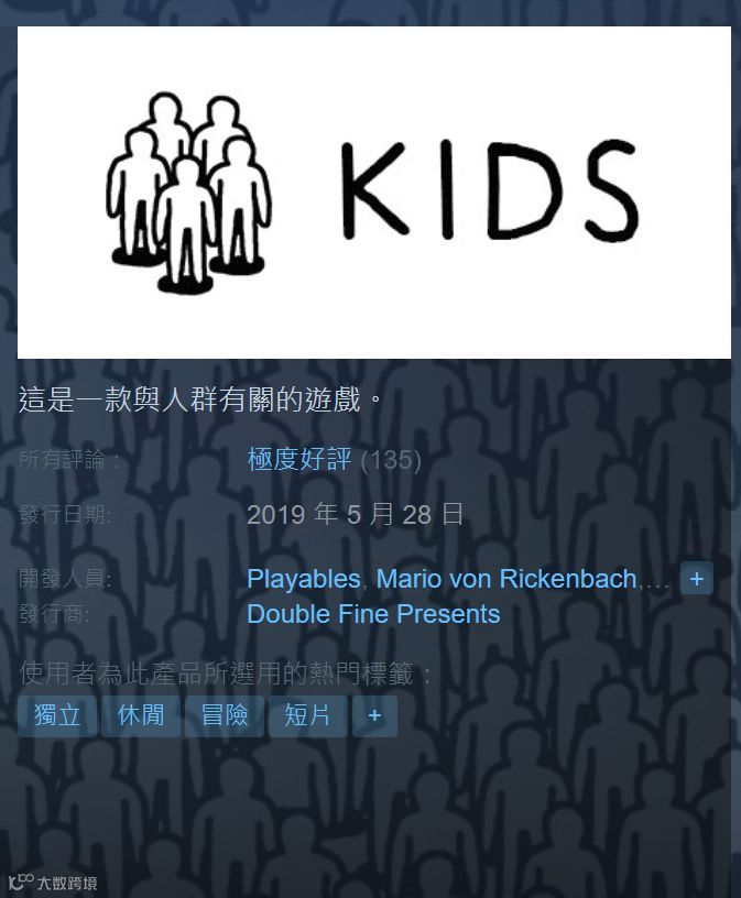 《KIDS》售价为15元,游戏时长预计在15-30分钟左右,此外还推出了手机版。评论区不少玩家都调侃道这游戏太引人深思了,以至于怀疑自己为什么要花15块钱、15分钟来玩这个游戏。不过,这游戏可是在steam上收获了“极度好评”的口碑,也是很多网友表示这是在借助不同的动画和形式暗喻人从小孩子时就天生的模仿和追从心理,非常值得一试。