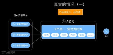 第一种是你的技术只是一个大产品里的一小个环节,离客户很远:比如A公司做了一款产品,假如A是一个教育类公司,我们假设它的产品在触达客户时是一堂优秀的课,而打造这堂优秀的课需要一系列链条:技术、交互、视觉、内容、情感等等。而我能给A公司提供的只是技术里的非常小的一环,大家可以看到我们离客户非常远,最终用户拿到的产品质量不由我决定,产品链条过长,你很难做到品控。