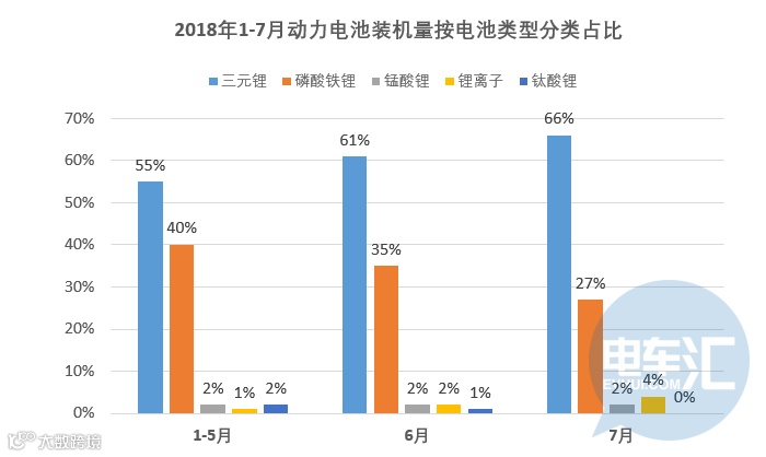 截止7月三元锂电池始终占据月度装机量55%以上, 且呈现递增趋势,“金九银十”或将再次登顶新的市场占有量;由于6月中旬的补贴政策“切换”,广泛应用磷酸铁锂的客车市场一路走低,磷酸铁锂电池市场占比顺势下跌;此外锰酸锂、钛酸锂等相对小众电池类型,市场表现变化带来的影响较小。