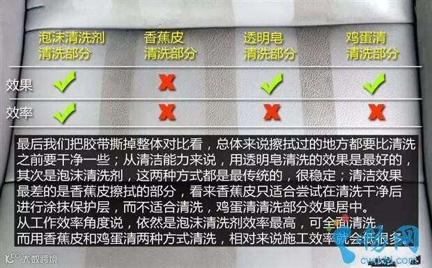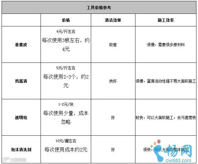 总之,流传的香蕉皮和鸡蛋清两种清洁方法,按照效果+价格+施工效率整体对比,并没有超越传统的泡沫清洗剂,所以并不能成为两种“终极解决方案”,而只能是根据具体情况酌情使用。