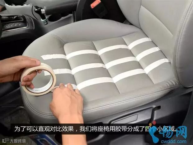 我的车座椅是灰色真皮的,虽然比米色真皮要耐脏一些,但是也已经被牛仔裤弄的够黑了,在施工之前首先把坐垫部分用胶带分成四个区域,分别使用上述的四种方法进行擦拭,看效果对比。