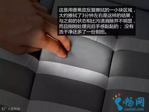 最终效果也不是理想,反复涂抹后皮面上的污渍只是稍微变浅了一点,并没有被去除掉,和之前透明皂去除污渍的效果相比相差的比较远,所以说用香蕉给车辆上的座椅进行美容,从工作量和效果两方面不太适用的,不推荐此方法。
