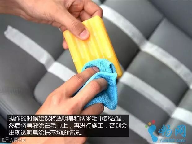 用透明皂清洗只需要一块皂+一块纳毛巾+一小桶清水,然后就可以施工了。注意不要直接用透明皂之间在座椅上涂抹,这样会涂的很不均匀,不好清理,最好是把透明皂沾湿后用手搓出皂液,涂在半干纳米毛巾上,然后再擦拭座椅皮面。