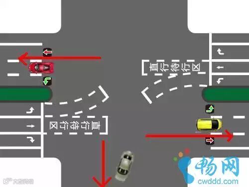 在左转指示灯变绿左转放行时,直行车辆即可前行到直行待行区,等待直行信号为绿灯。