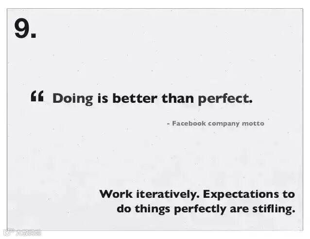 9、迭代工作,期待完美收工会令人窒息:“做完事情,要胜于完美收工” Facebook 办公室墙壁上贴的箴言。动手做,胜过任何完美的想象。