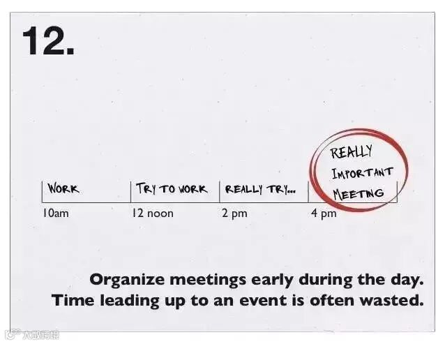 12、有会议就尽早安排,用于准备会议的时间往往都浪费掉了。