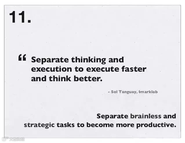 13、把会议和沟通 (邮件或电话) 结合,创造不间断工作时间:一个小会,也会毁了一个下午,因为它会把下午撕成两个较小的时间段,以至于啥也干不成。