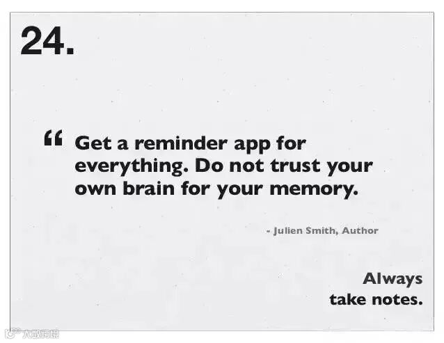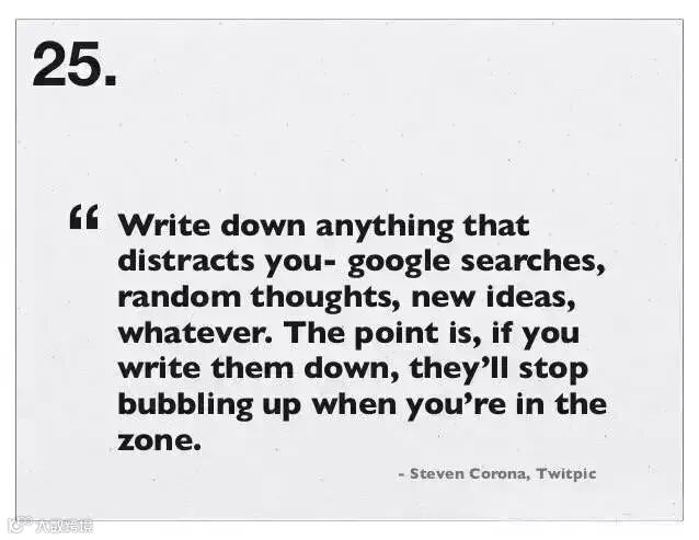 25、进入高效状态后,记下任何分散你注意力的东西比如Google搜索词、灵光乍现的想法、新点子等等。如果你把它们记下来,它就不会再蹦来蹦去了。