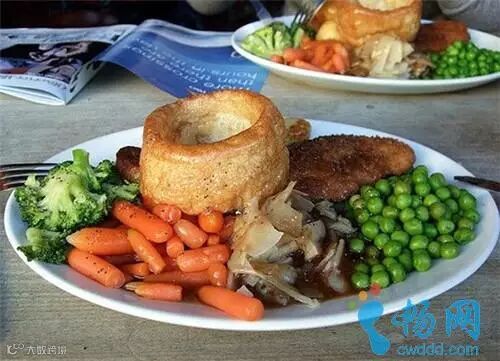 约克郡布丁(yorkshire pudding)是英国的一种食品。它是英国人周日晚餐的重要组成部分,多为烤牛肉的配菜,以它独特的牛肉香味闻名世界。“烤牛肉加约克郡布丁”甚至被称为英国的国菜。 约克郡布丁并不是我们想象中的那种布丁,它更像是一种面包,口感也类似软面包,味道略带咸,呈咖啡杯的形状,中间凹陷及绵软,外围则香脆。由于约克郡布丁易于吸收肉汁,因此与烤牛肉以及牛肉浓汁(gravy)一起食用,味道鲜美可口。