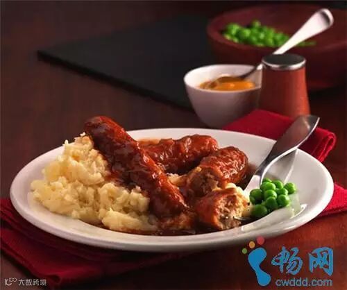 英国酒吧点单率极高的一道菜,几乎每家都有,是香肠和土豆泥、香肠主要以湖区特产的坎伯兰香肠为最佳选择。通常一份是3根香肠铺在大量土豆泥上,或是一长条的绕成圆圈的香肠。因为土豆在英国被看作是主食之一。然后淋上相当于英国“耗油”的洋葱牛肉汁。也有的地方,配合当地的特色,加入了派或布丁。