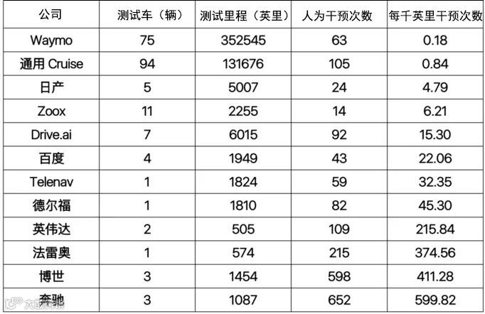 DMV的报告中最核心的是两个数据:一为某公司在加州测试自动驾驶车的总里程。二为自动驾驶测试中发生的“脱离”(disengagement)数,“脱离”即车辆的自动驾驶系统Hold不住,必须中断自动驾驶模式的情况。