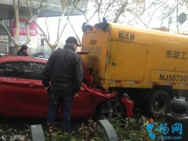 2014年11月25日,南京中山北路紫峰大厦门口发生一起汽车追尾事故,一辆红色宝马跑车直接钻进了前方一辆汽车尾部,引擎盖被完全掀起。