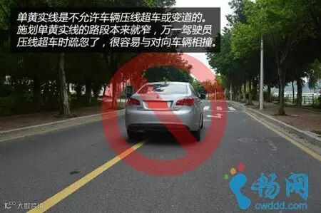 违禁危害:施画单黄实线的路段一般比较狭窄,通行条件较差,如果车辆违法越线超车,容易与对向来车发生事故。