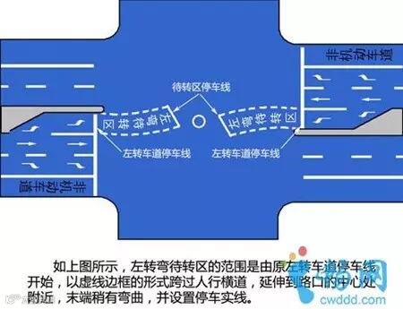 在一些路面较为宽阔而又设有多个方向信号灯的路口,我们常常会见到在左转弯车道前方有这样一块用白色虚线施画出来的区域,这就叫做左转待转区。