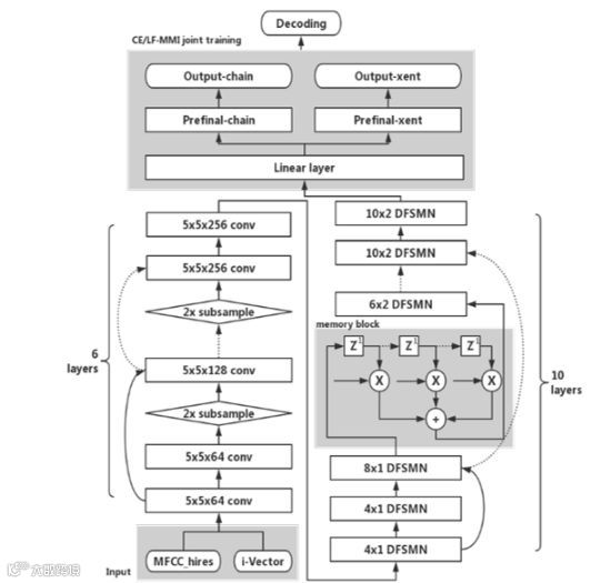 训练方式使用 lattice-free 最大互信息(lattice-free maximum mutual information,LF-MMI/Chain)与交叉熵(cross entropy,CE)损失函数相结合的多任务学习技术;