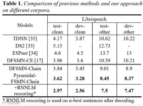 最后,作者使用了 RNNLM rescoring 技术对解码做进一步处理。在没有 RNNLM rescoring 的情况下,Pyramidal-FSMN 已经达到了目前最好的结果,rescoring 之后又有了更进一步的提升。