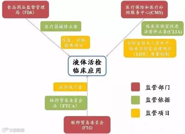 美国液体活检服务主要有两种提供形式:(1)经FDA审批的相关仪器和配套试剂盒;(2)经医疗保险和医疗补助服务中心(CMS)认证的第三方实验室。同时,相关产品服务的宣传由联邦贸易委员会(FTC)监管,在广告中不得存在错误和虚假宣传的情况。