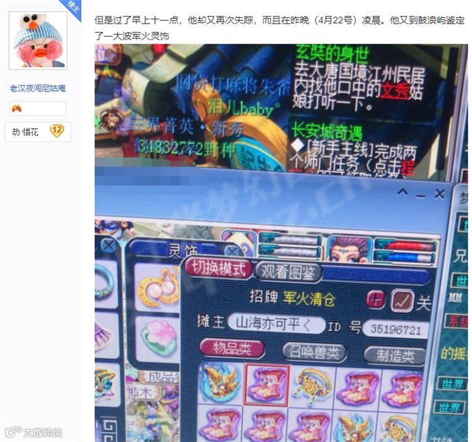 本来如此进行下去便相安无事,各取所需。但是,在近日,玩家看见区里藏宝阁有一个晶清头,价格在自己能够接受的范围,但是人嘛,总想要再便宜点,看着卖家的名字正好就是长期交易军火的那位老板,玩家就找到老板,问装备是不是他的,希望可以少一些。而在于老板讨价还价的过程中,老板提及自己还有一些垃圾灵饰和一把150的不磨扇子,如果有玩家想要的话,可以便宜点打包卖。玩家想了想,觉得协商的价格可以接受便答应了下来。随后在线下转账一次1700,一次1.5W,但是,玩家只拿到了不磨扇子和4车半的垃圾灵饰,晶清头一直不见踪影。