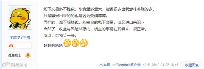看到又是因为线下交易被骗,就有玩家调侃道:“线下的交易多不胜数,所有曝光出来的都是由于受骗,因为收益和风险是并存的,并不单单只存在高收益的现象。”
