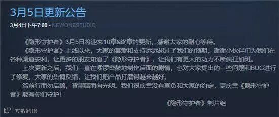玩家进行的每个选择都代表主角肖途走上了一条路而失去了另一个可能,在这条艰难的卧底之路上,他失去了友情爱情以及更多的更多,为了那份虚无缥缈的希望他成为了自己最讨厌的人。放在曾经有过那段屈辱历史的我国这样的剧情就更能让人感同身受,steam评论区90%的好评率和登顶热销榜的成绩就已经证明了游戏的剧情到底有多让人共鸣。同时据爆料《隐形守护者》,即将登陆wegame。