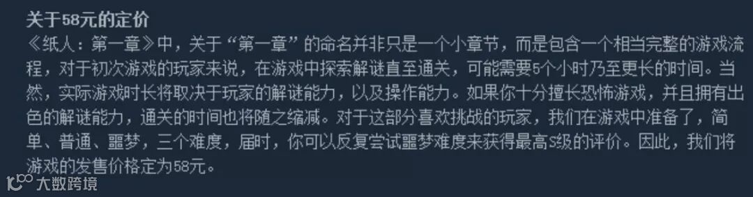 之前上线的《纸人:第一章》,这个“第一章”并不只是一个小章节,而是包含了一个相当完整的游戏流程。并且,根据官方解释这款游戏58元的定价是由玩家通关的时间来决定的。游戏大概需要花5-8小时的时间,但实际上游戏的时长最终还是取决于玩家的解谜能力以及操作能力。如果你已经是一名恐怖游戏老手,十分擅长这一类型,通关的时候当然也会减少。