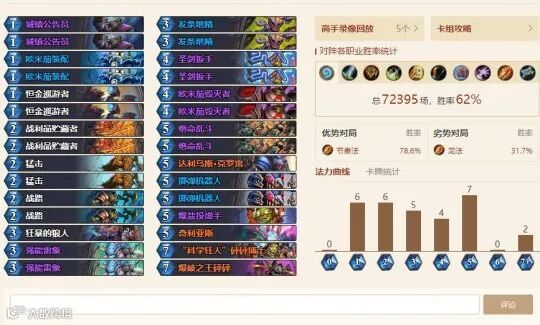 而战士的强势卡组,则依旧为横扫天梯多日的炸弹战。不过随着天梯中诸如树人德、节奏贼以及中速猎等卡组的增多,防战形态的战士也有着不错的胜率。