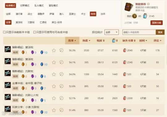 九大职业中,最惨的莫过于牧师了。很长一段时间内,牧师不是前期克敌制胜的职业。他们往往需要苟活到游戏的后期,才能够拿下比赛。但是在退环境和荣誉室之后,牧师在中前期的苟活能力大大下降。同时在打到后期的时候,由于卡牌质量相比之前的扩展包有比较大的差距,因此现版本的牧师可谓是相当难过。可以看到的是,即使是牧师职业的强势卡组,胜率比起其他职业也是有着不小的差距。