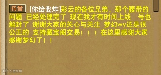好在CC直播是有录像功能的,而CC520作为梦幻西游电脑版的官方直播频道,遇到这种情况当然不会姑息,事件很快得到了处理。腰带卖家你给我炸和买家涛哥都分别发了动态,表示腰带事件已经处理好,交易还是要选CBG,安全,放心!实力为CBG代言打Call!