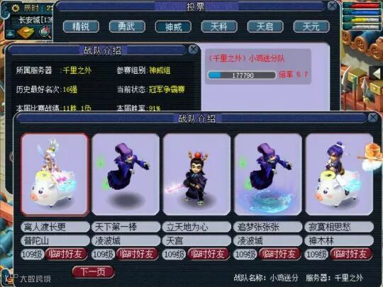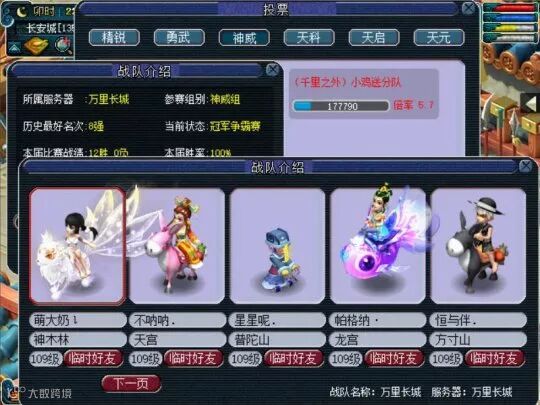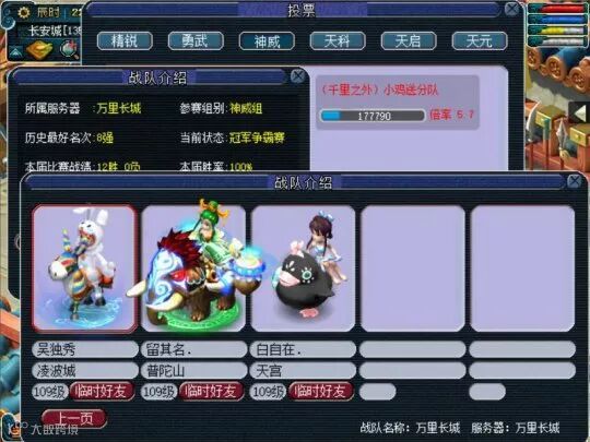 万里长城最好的成绩是8强,小鸡送分最好的成绩为16强,这次两支队伍能杀进冠军赛可谓相当不易,到了圆梦的时刻千万不能大意,按照以往神威的打法,一般都是持久战,双封甚至三封阵容比较常见,不过这次门派调整,凌波城增加抗封几率,在输出方面比较稳定,所以凌波城肯定会上的,至于另外一个就看指挥如何选择了,不过给笔者选择的话,我会上双凌波城开鸟阵抢物理一速。在神威组方面,千里之外略胜一筹。