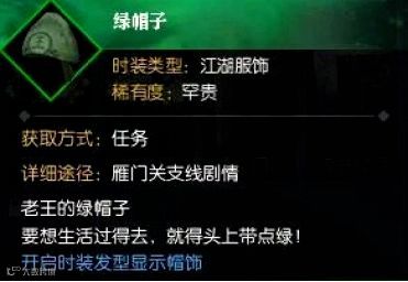 另外,心思细腻的你有注意到除了称号外,大侠头上还有一抹绿么?没错!玩家在“老王寻情记”的任务中,帮助老王一路探寻青梅竹马小芳的消息,便可获得永久头饰奖励——“老王的绿帽子”,嫩绿的原谅色再搭配“当然是选择原谅她(他)”这一称号. . .不得不说,官方玩梗最为致命。