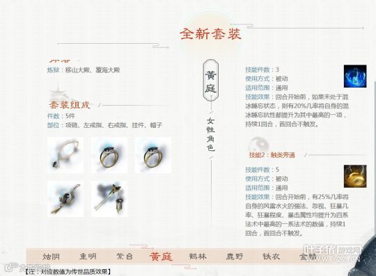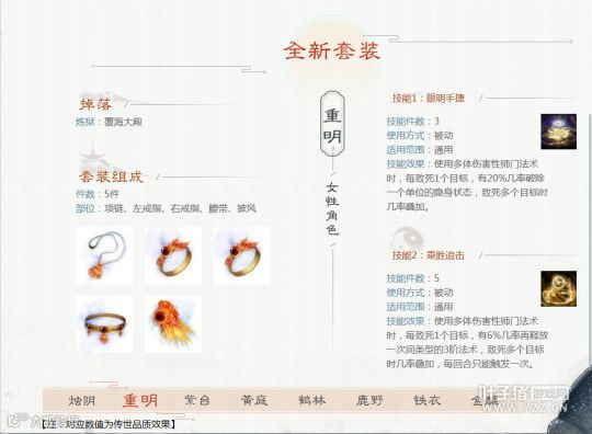 女性:3件搭配灵台、3件搭配惊鸿、5件搭配兰心提抗、5件搭配于归回血