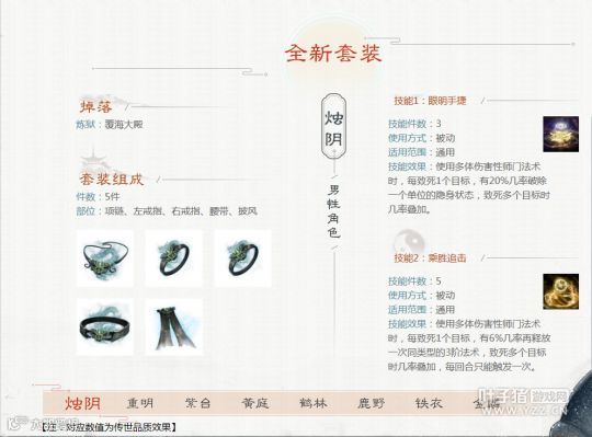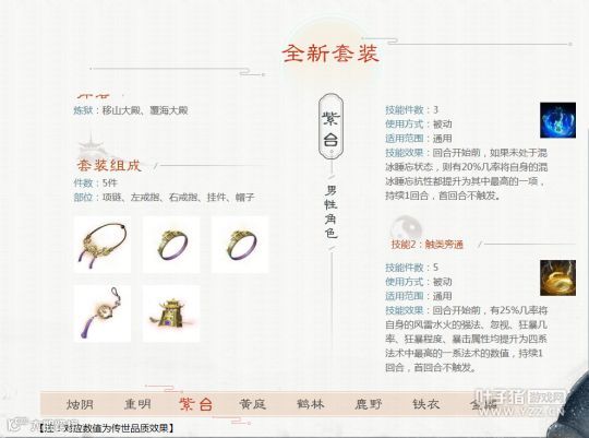 男性:3件搭配天荒、3件搭配容止、5件搭配雅声提抗、5件搭配破军回血