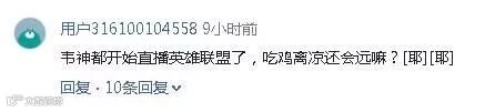 不过在韦神直播LOL后也有网友开始质疑:连韦神都开始播英雄联盟了,离吃鸡凉掉还会远吗?