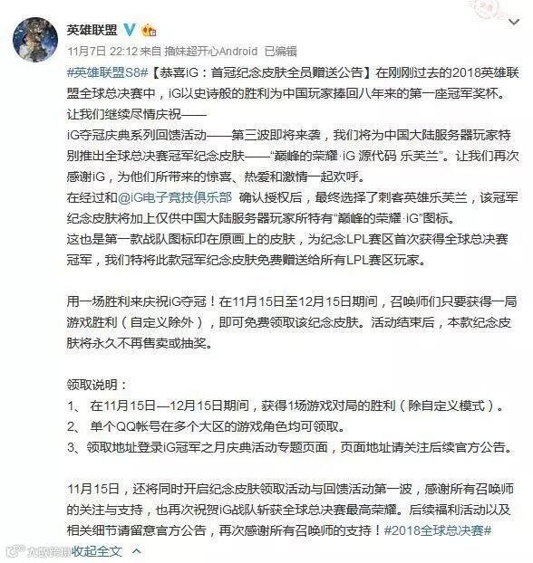 在经历了此前被多番吐槽之后,昨晚《英雄联盟》官博发布了LPL首冠纪念皮肤全员赠送的公告: