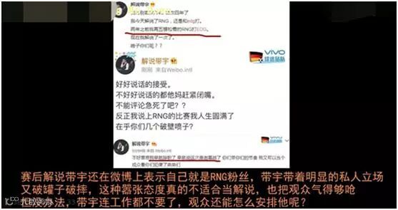 事后,带宇就在微博发言声称自己是RNG的粉丝,而且已经自爆辞职。破罐子破摔的态度把观众气的没办法,这样的人观众怎么安排他呢?