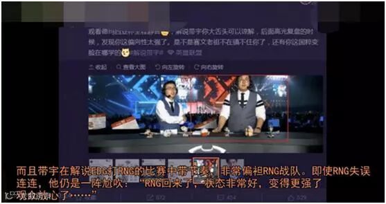 但是有一名男解说却遭到了众多召唤师们的抵制,他就是德杯第一天开赛时的解说带宇。带宇这名解说有点大舌头,音色让人反感,游戏理解也不高,话又多,让观众的观赛体验非常差。尤其是在RNG对阵EDG的时候,带宇对RNG是有些偏袒的,RNG优势回来了,变得更强,观众放心了……这样的话确实引起不少观众反感,网友评论甚至需要比赛静音了。